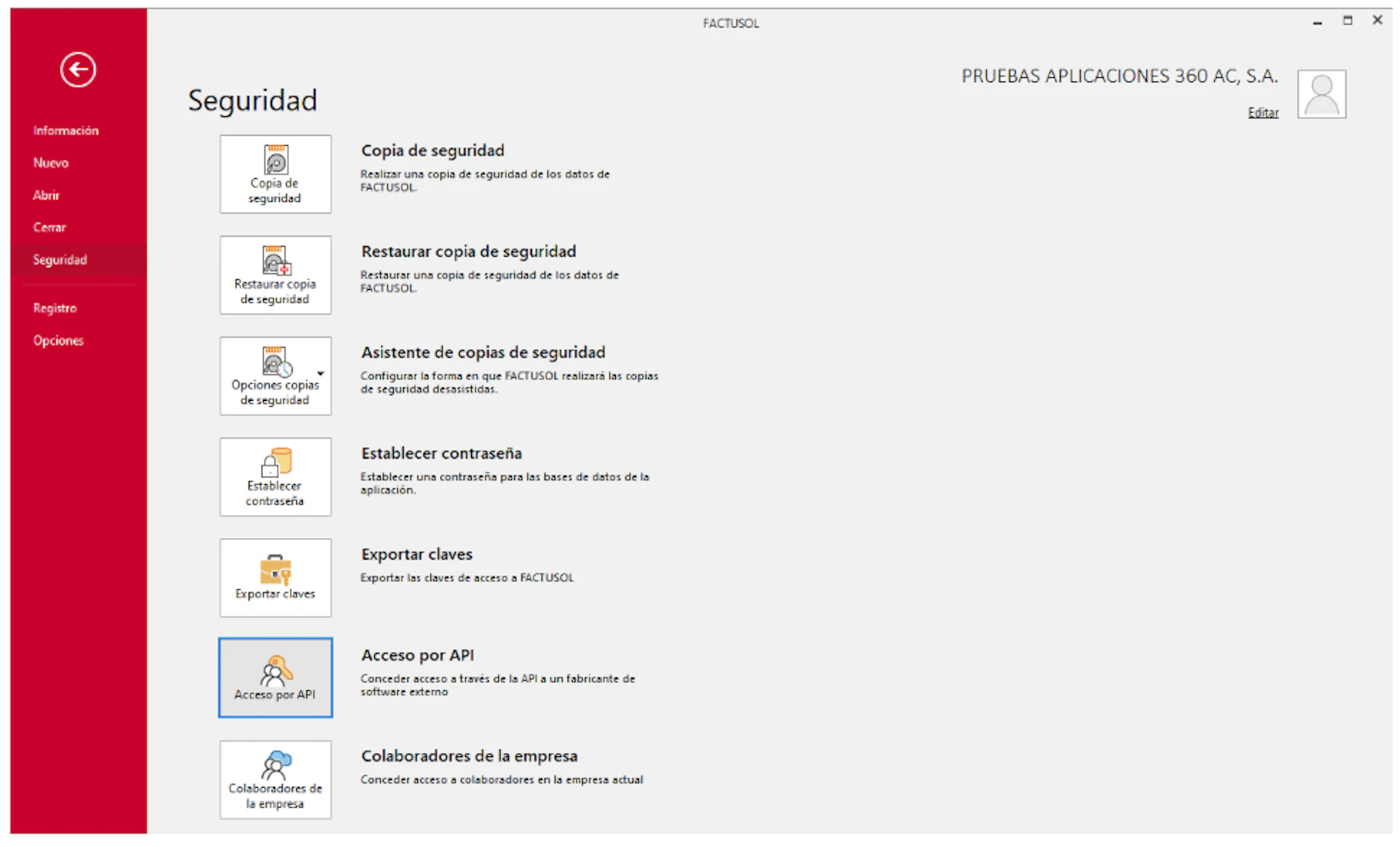 Para conectar eVins con Factusol, primero hay que dar permisos a eVins desde Factusol. Para ello, dirigete a Factusol, haz clic en "Archivo" y selecciona "Seguridad". Luego haz clic en la opción "Acceso por API"
